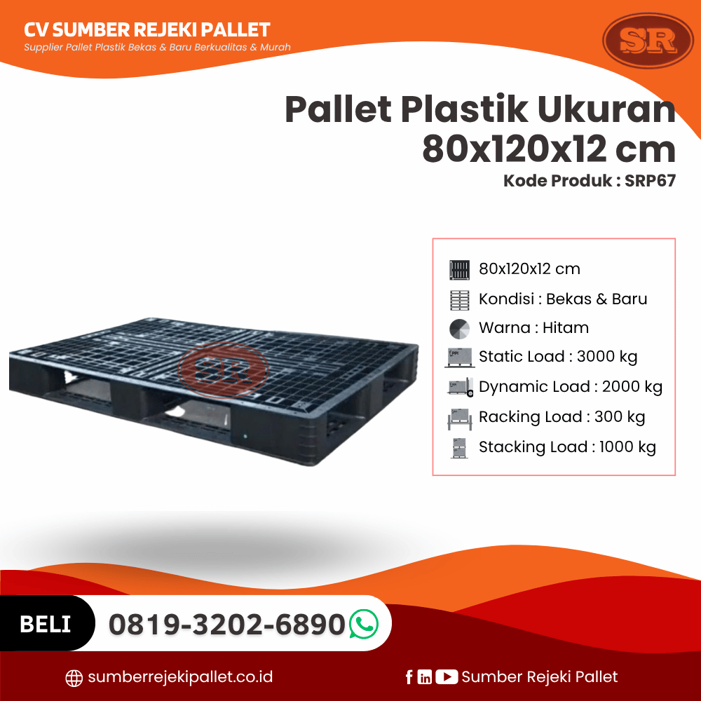 Dalam dunia industri yang terus berkembang, efisiensi logistik dan keamanan produk menjadi kunci keberhasilan rantai pasok. Salah satu elemen penting dalam mendukung kelancaran proses distribusi adalah pemilihan media angkut dan penyimpanan barang yang tepat. Untuk menjawab kebutuhan tersebut, CV Sumber Rejeki Pallet, perusahaan terpercaya dalam penyediaan pallet plastik bekas dan baru, menghadirkan produk unggulan kami: Pallet Plastik SRP67 ukuran 80x120x12 cm.